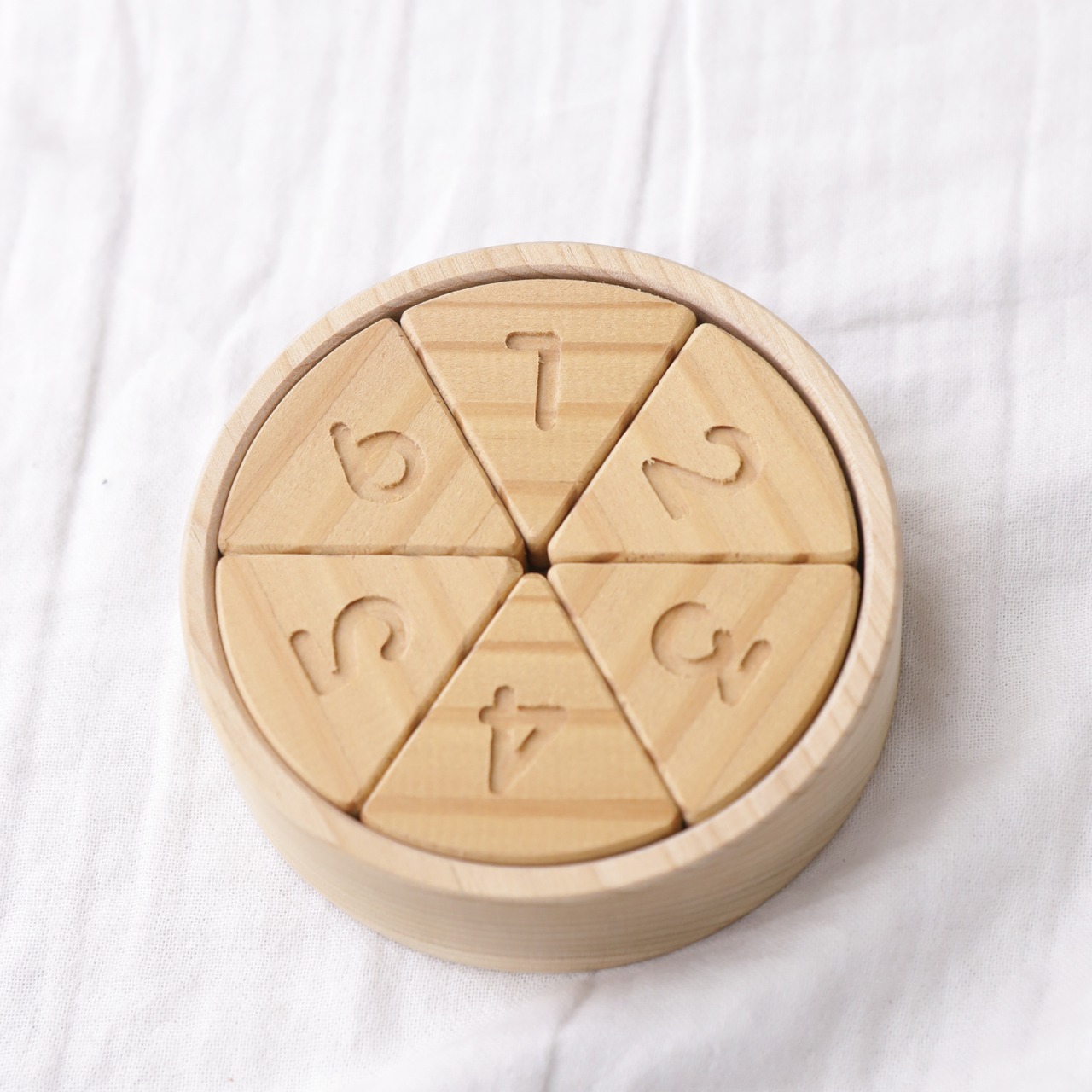 チーズをかじるネズミ、ネコのイラスト、アラビア数字とローマ数字が描かれた木製のパズルです。